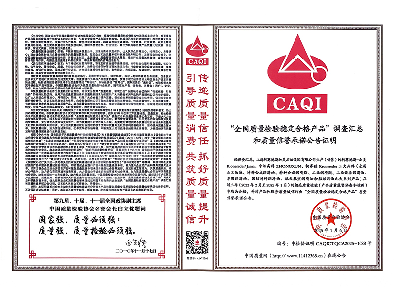 新年伊始,上海柯賽德斯加美石油集團有限公司收到來自中國質量檢驗協會的證書(編號:中檢協證明 CAOICTOCA2025-1088號),證書說:經調查匯總,上海柯賽德斯加美石油集團有限公司生產(銷售)柯賽德Kroneseder、中訊高科ZHONGXUN、的柯賽德斯-加美潤滑油Kroneseder·Jama 三大品牌(金屬加工油液、特種合成潤滑油、特種合成潤滑脂、工業潤滑脂、工業設備潤滑油、車用潤滑油、國防特種潤滑油、航天航空潤滑油和船舶用油九大系列產品)在近三年(2022年2月至2025年1月)的產品質量監督抽查和檢測中均為合格,并對產品和服務質量誠信作出“全國質量檢驗穩定合格產品”質量信譽承諾公告。